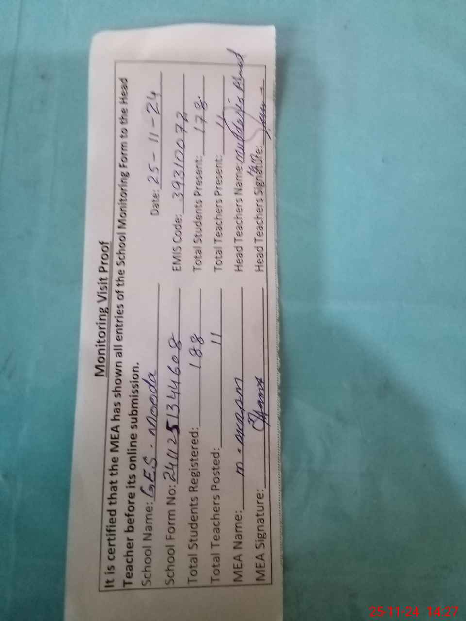 | Attendance Register | Head Teacher | MEA with School | Visit Proof |