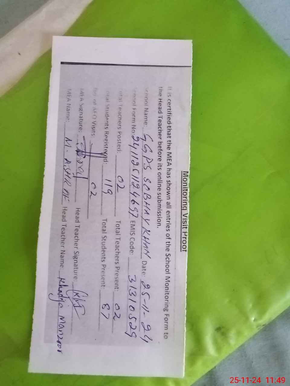 | Attendance Register | Head Teacher | MEA with School | Visit Proof |