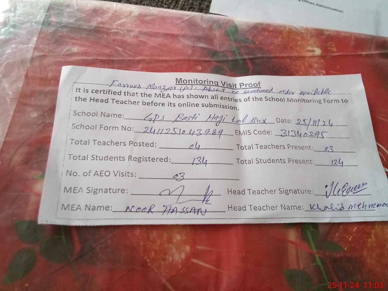 | Attendance Register | Head Teacher | MEA with School | Visit Proof |