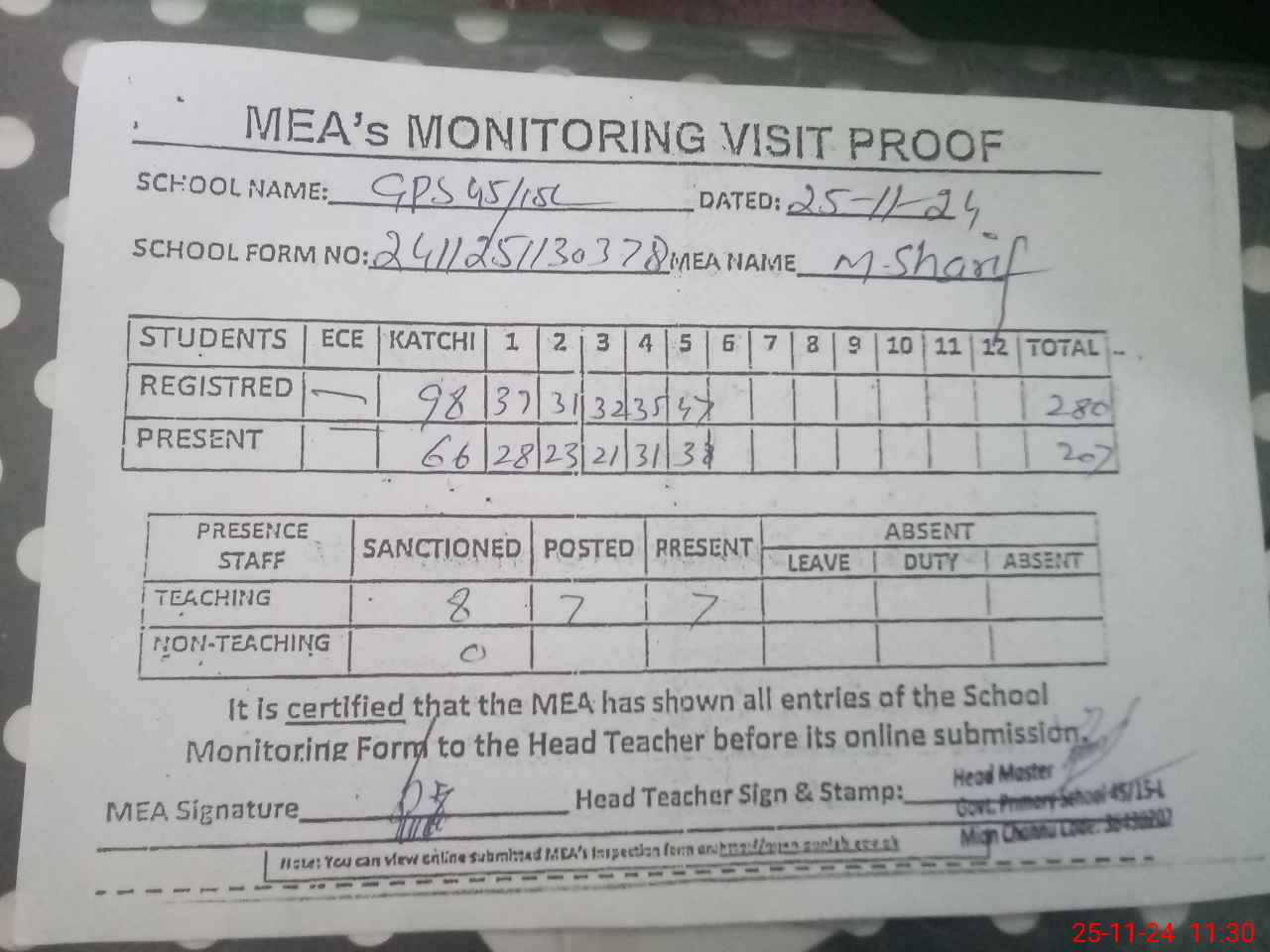 | Monitoring Date: 25-11-2024 | Start Time: 25-11-2024 11:09 AM | End Time: 25-11-2024 11:37 AM | Name of MEA: MU**** SH**** | |