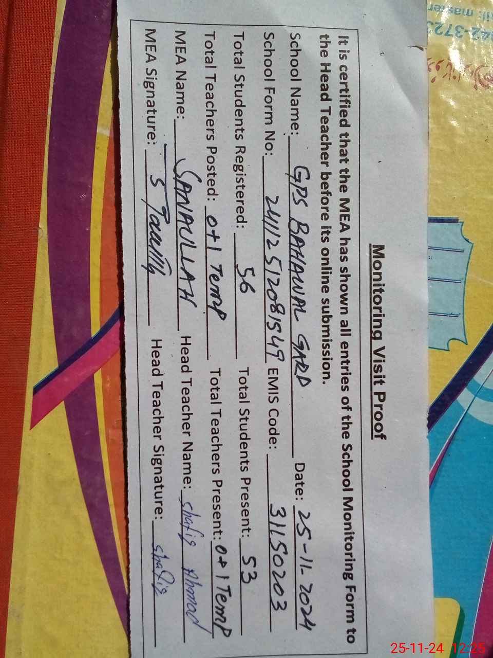 | Attendance Register | Head Teacher | MEA with School | Visit Proof |