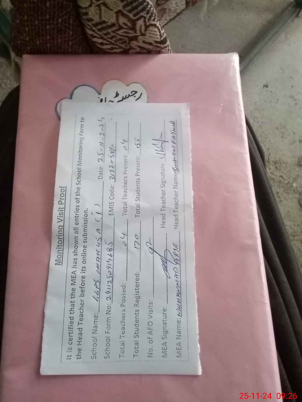 | Attendance Register | Head Teacher | MEA with School | Visit Proof |