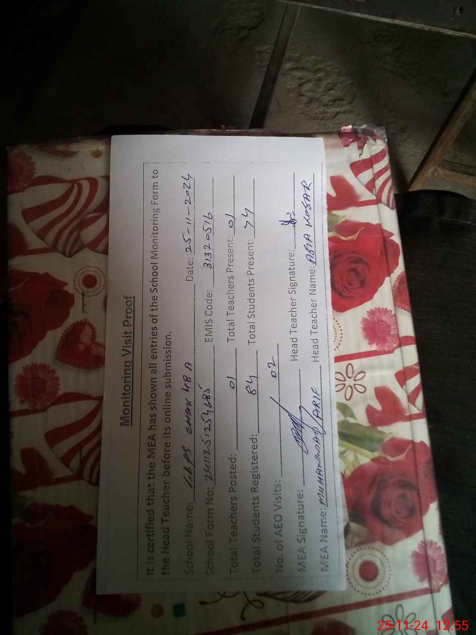 | Attendance Register | Head Teacher | MEA with School | Visit Proof |