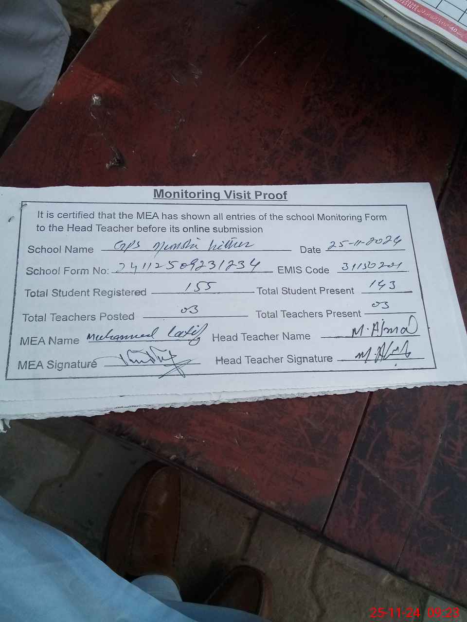 | Attendance Register | Head Teacher | MEA with School | Visit Proof |
