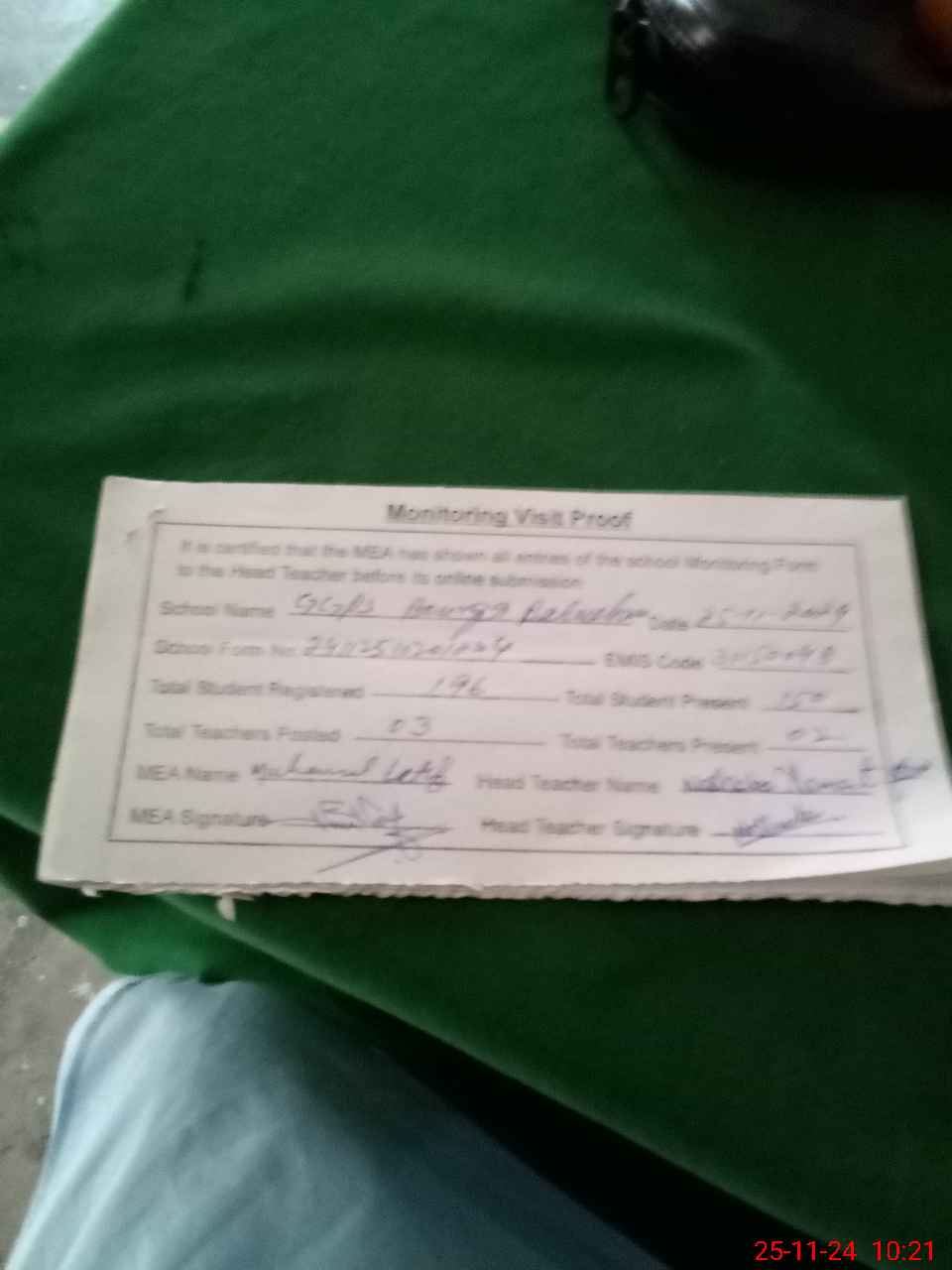 | Attendance Register | Head Teacher | MEA with School | Visit Proof |