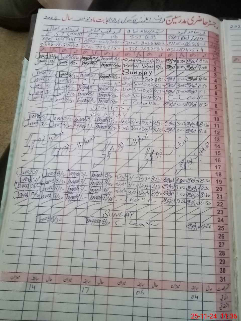 | CNIC | Full Name | Designation | R/C | Absence during last cal. month |