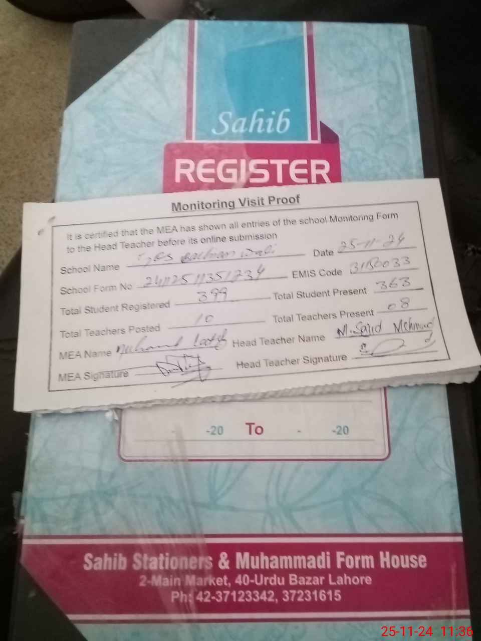 | Attendance Register | Head Teacher | MEA with School | Visit Proof |