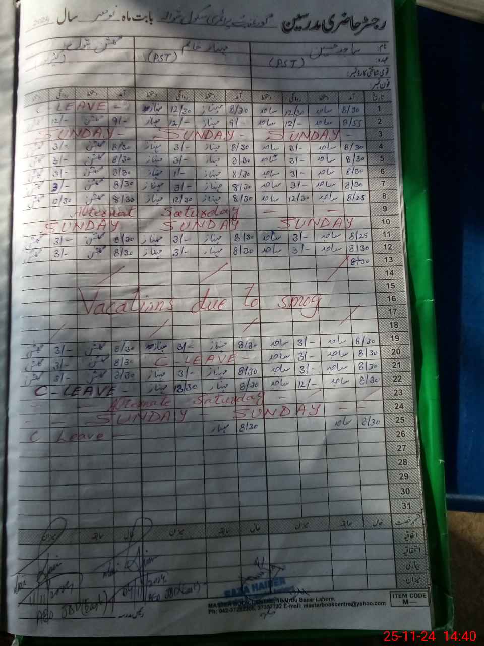 | CNIC | Full Name | Designation | R/C | Absence During Last Calender Month |