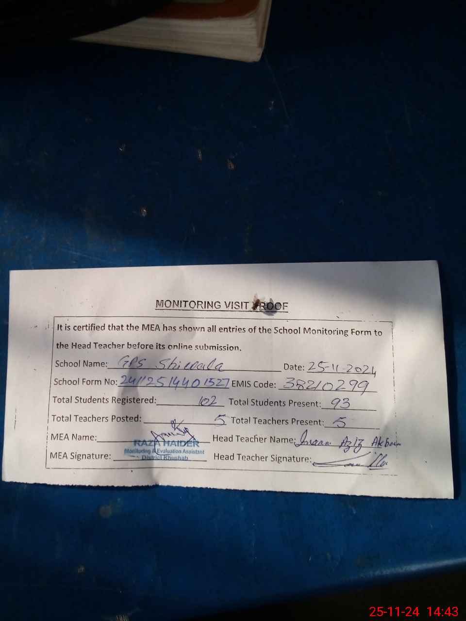 | Attendance Register | Head Teacher | MEA with School | Visit Proof |