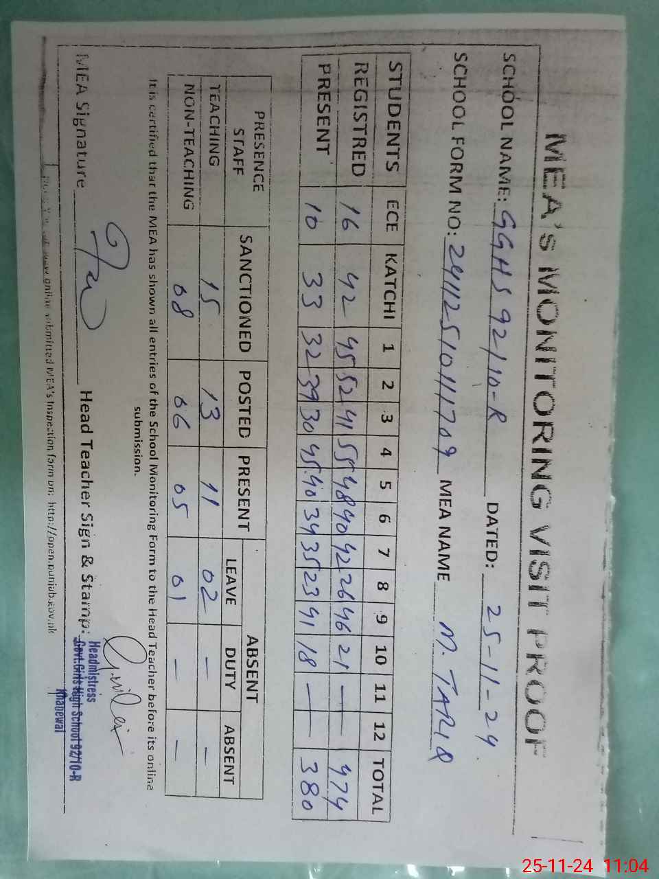 | Attendance Register | Head Teacher | MEA with School | Visit Proof |