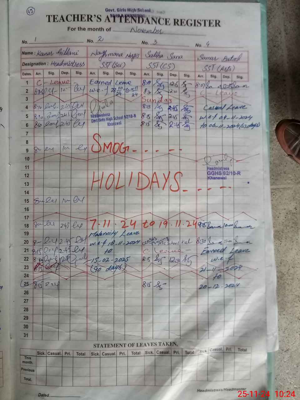 | Leave | Duty | Absent | Maternity | Medical | Ex- Pak |