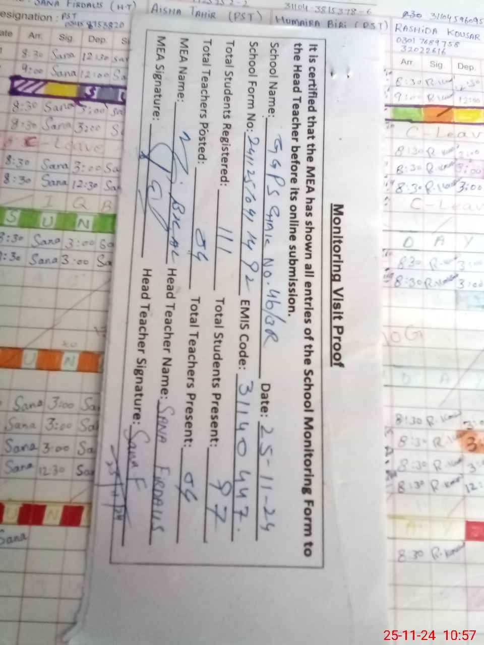 | Attendance Register | Head Teacher | MEA with School | Visit Proof |
