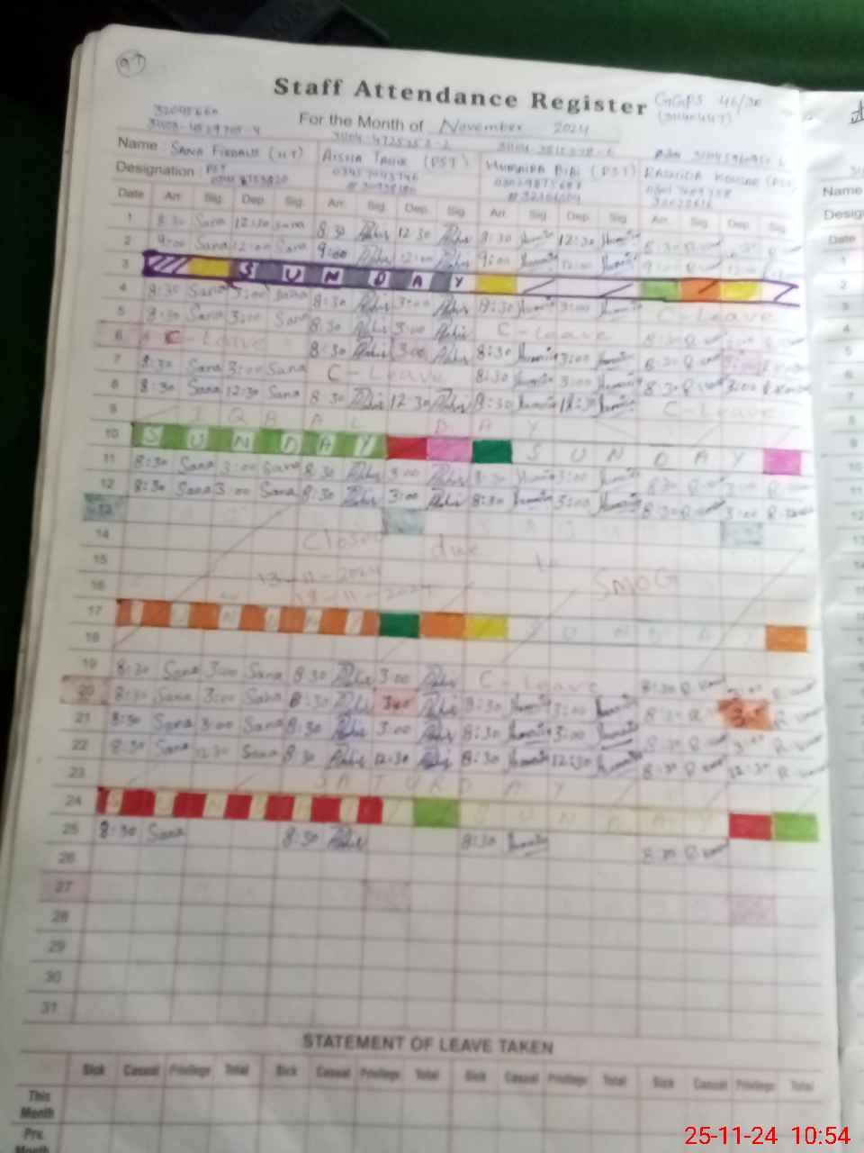 | Leave | Duty | Absent | Maternity | Medical | Ex- Pak |
