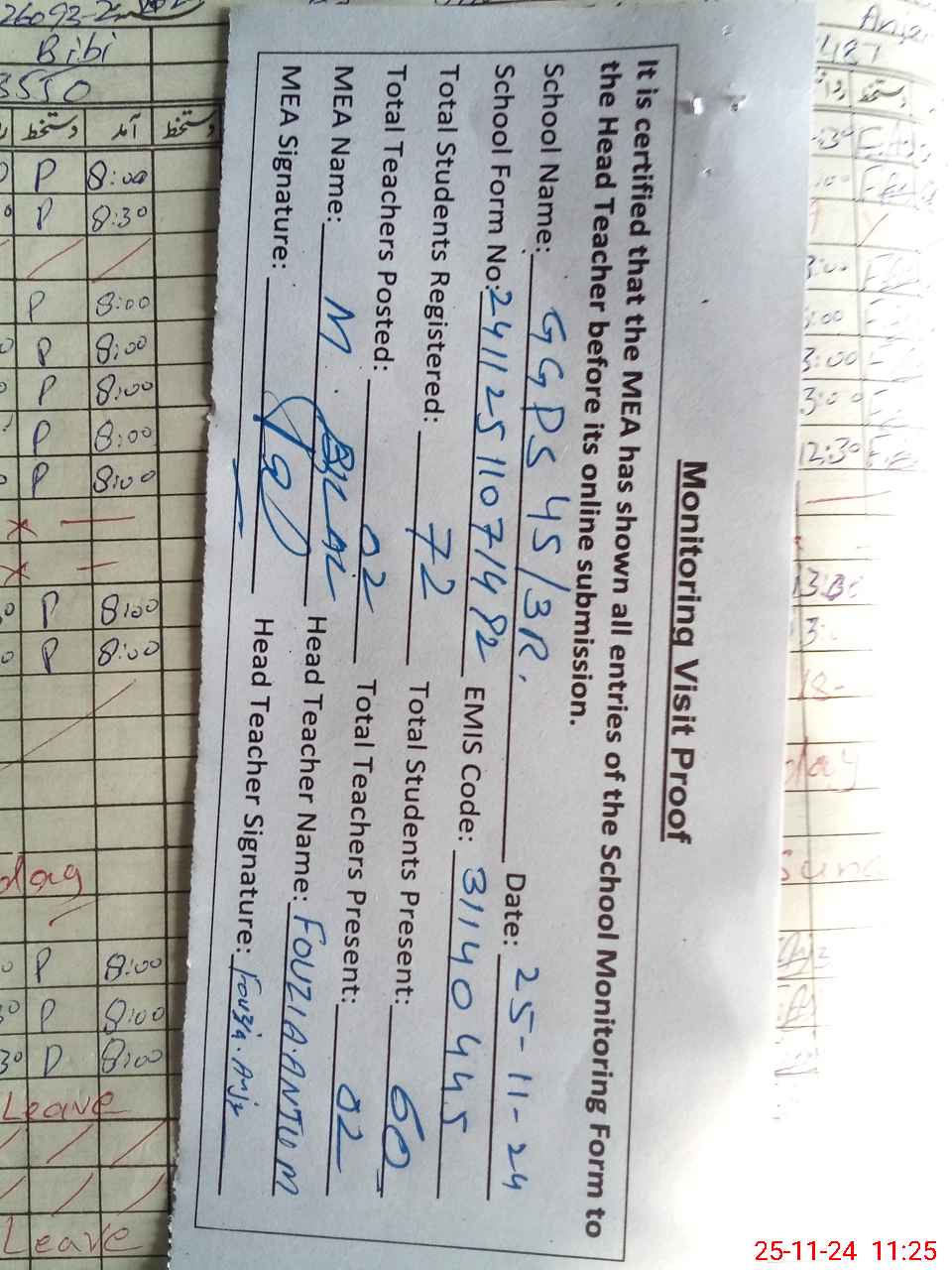 | Attendance Register | Head Teacher | MEA with School | Visit Proof |