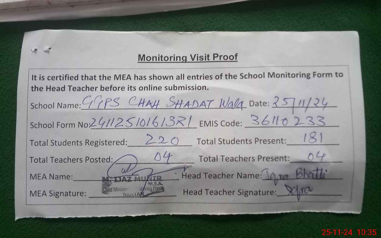 | EMIS Code: 36110233 | Name of School: GGPS CHAH SHAHADAT WALA MULTAN | |||