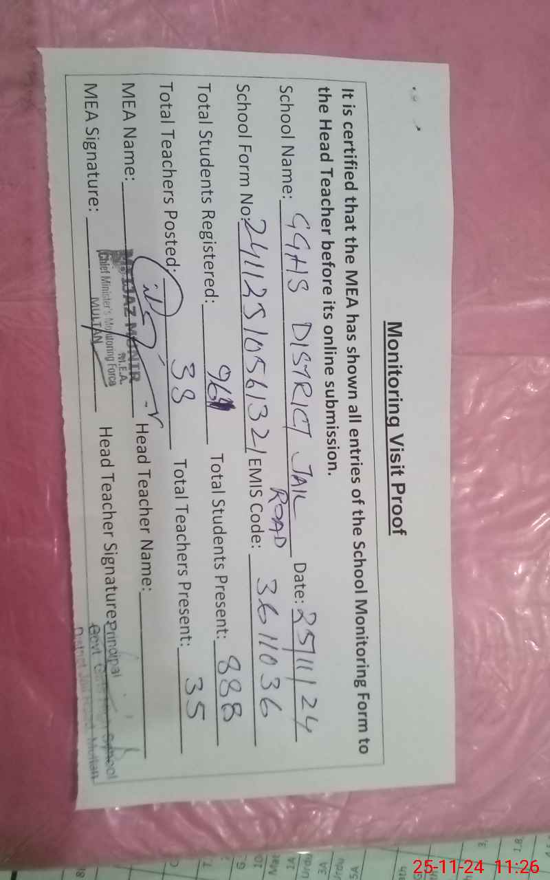 | EMIS Code: 36110036 | Name of School: GGHS DISTRICT JAIL ROAD MULTAN | |||