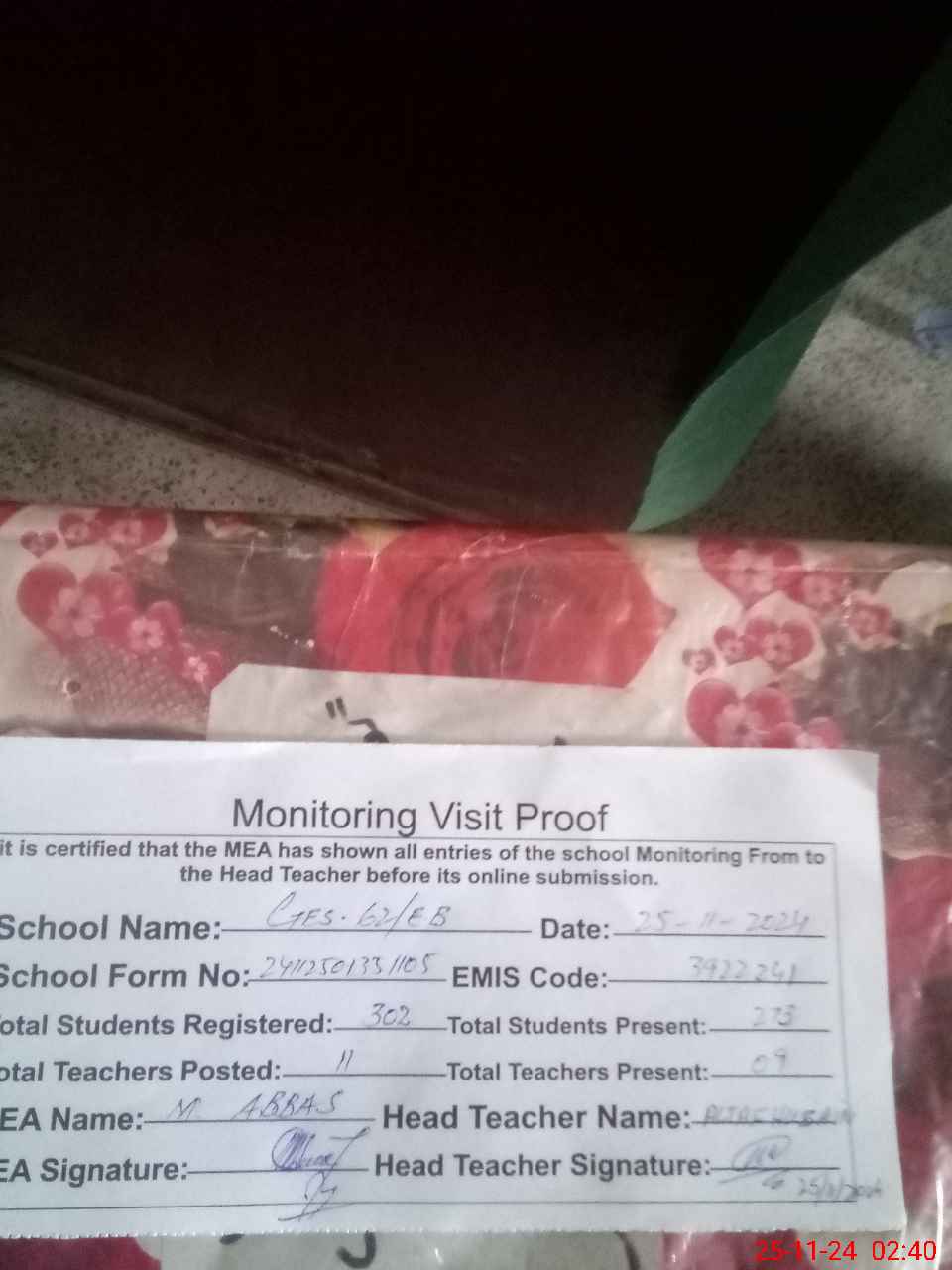 | Certified that this School was Inspected by the Undersigned MEA/DMO Today and the Information Stated Above is as Per Record. | |||||