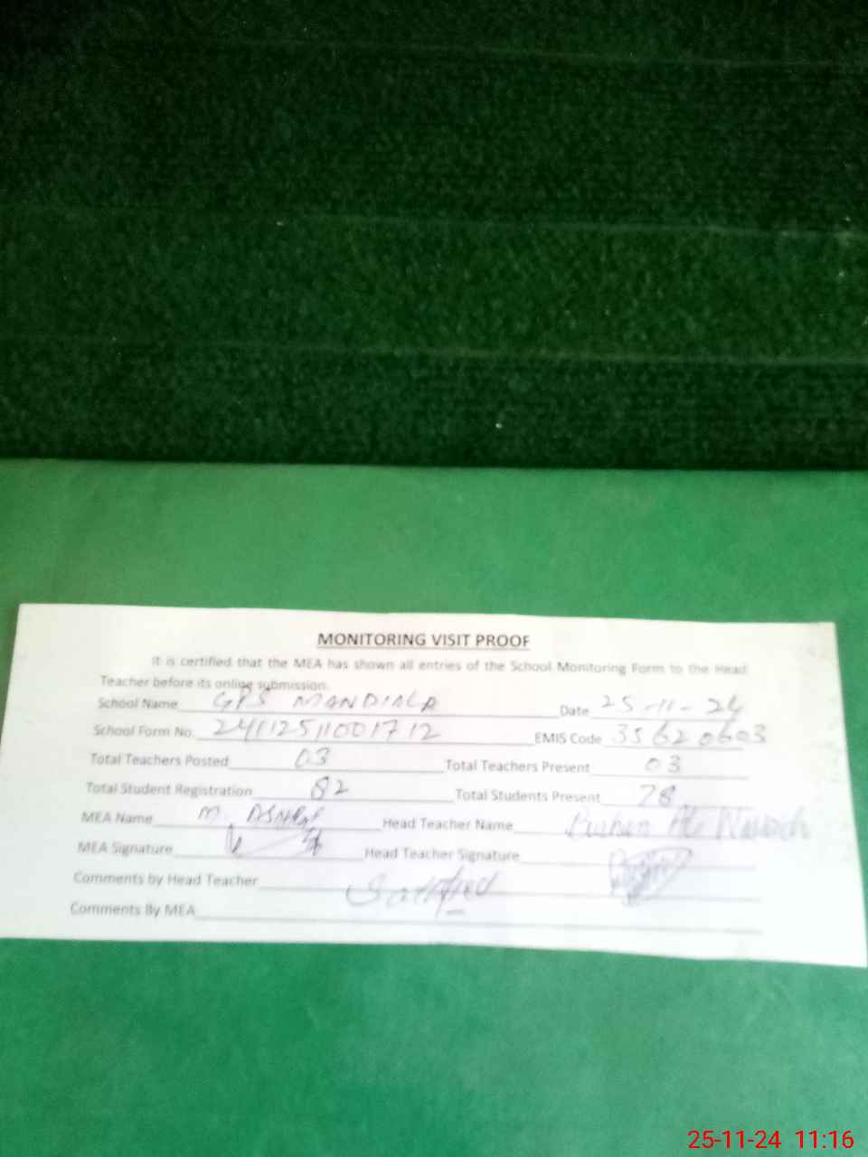 | Attendance Register | Head Teacher | MEA with School | Visit Proof |