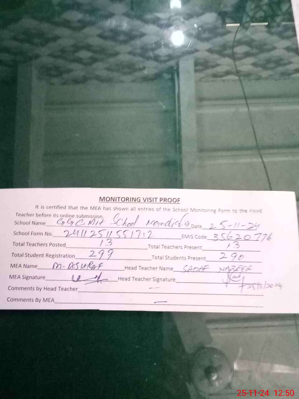 | Attendance Register | Head Teacher | MEA with School | Visit Proof |