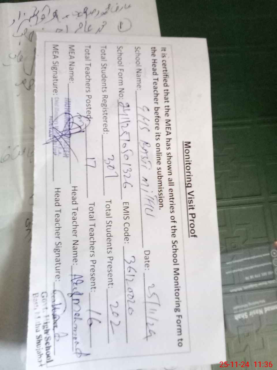 | Attendance Register | Head Teacher | MEA with School | Visit Proof |