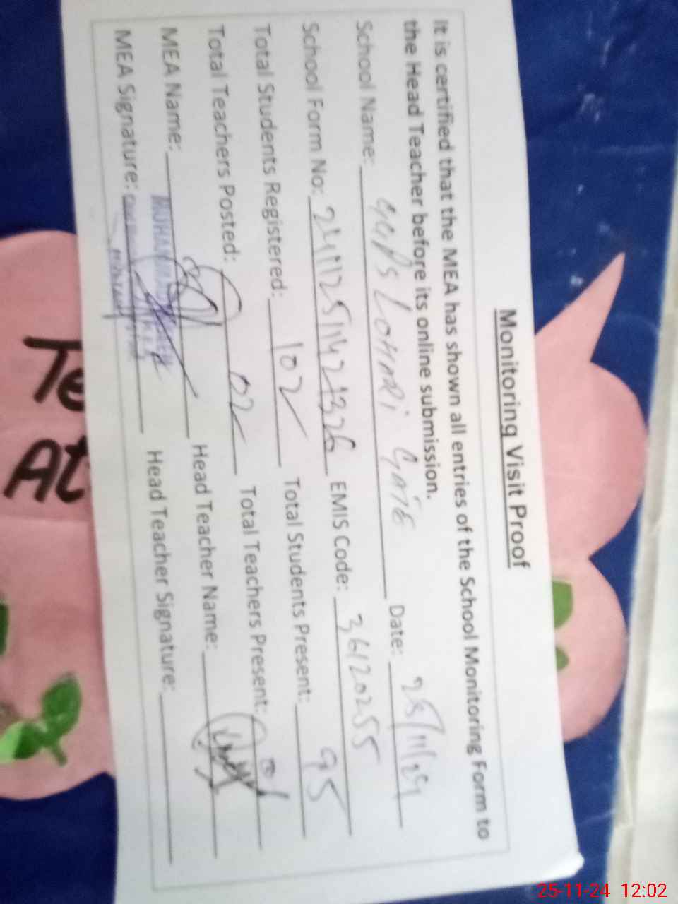 | Attendance Register | Head Teacher | MEA with School | Visit Proof |