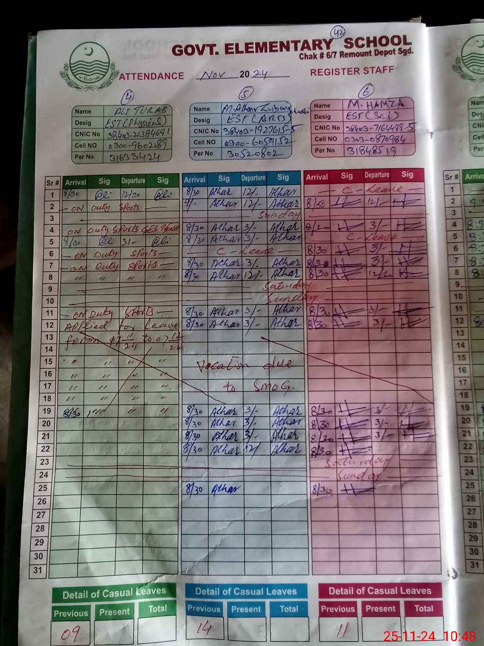 | CNIC | Full Name | Designation | R/C | Absence During Last Calender Month |