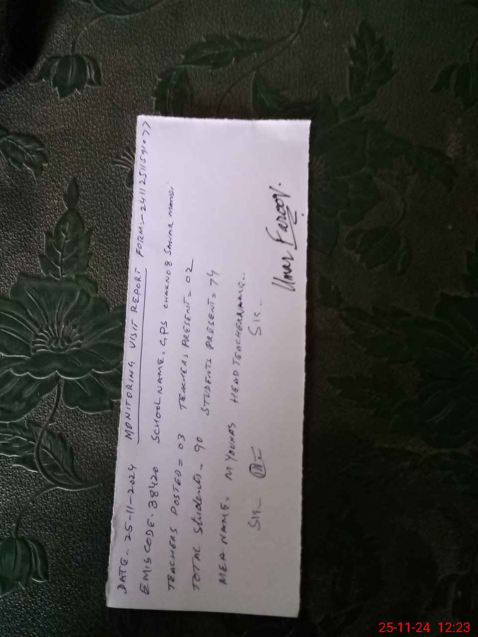 | Name: UM**** FA**** Designation: (School Headmaster's/Headmistress's) PST Phone/Cell Number: 03**** |