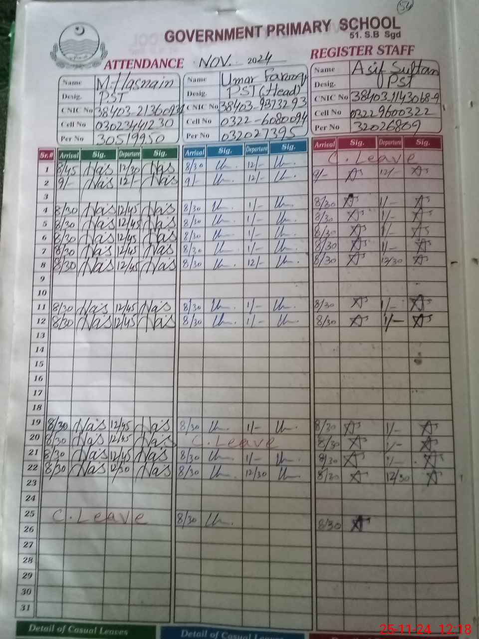 | CNIC | Full Name | Designation | R/C | Absence during last cal. month |