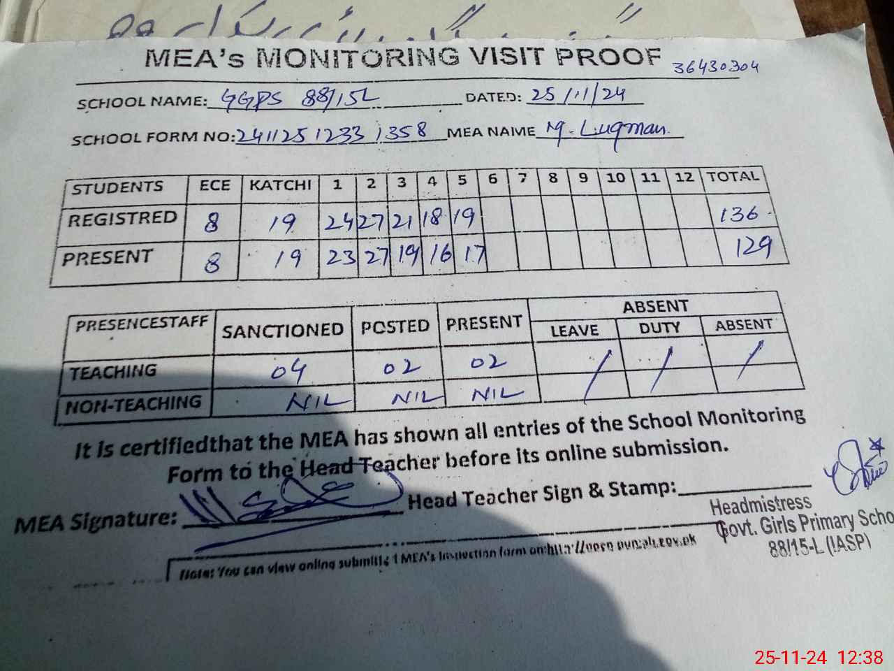 | Attendance Register | Head Teacher | MEA with School | Visit Proof |