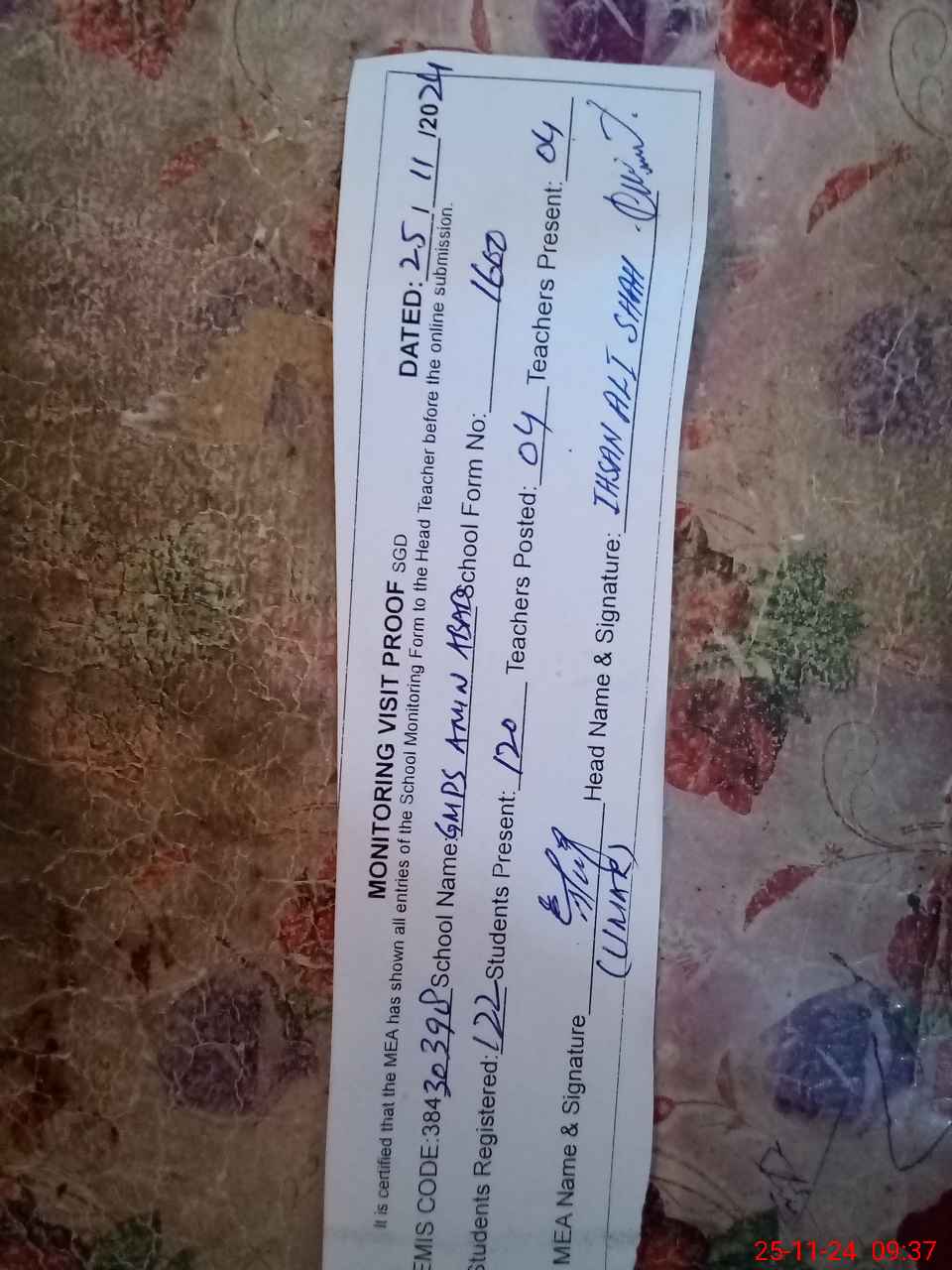 | Attendance Register | Head Teacher | MEA with School | Visit Proof |
