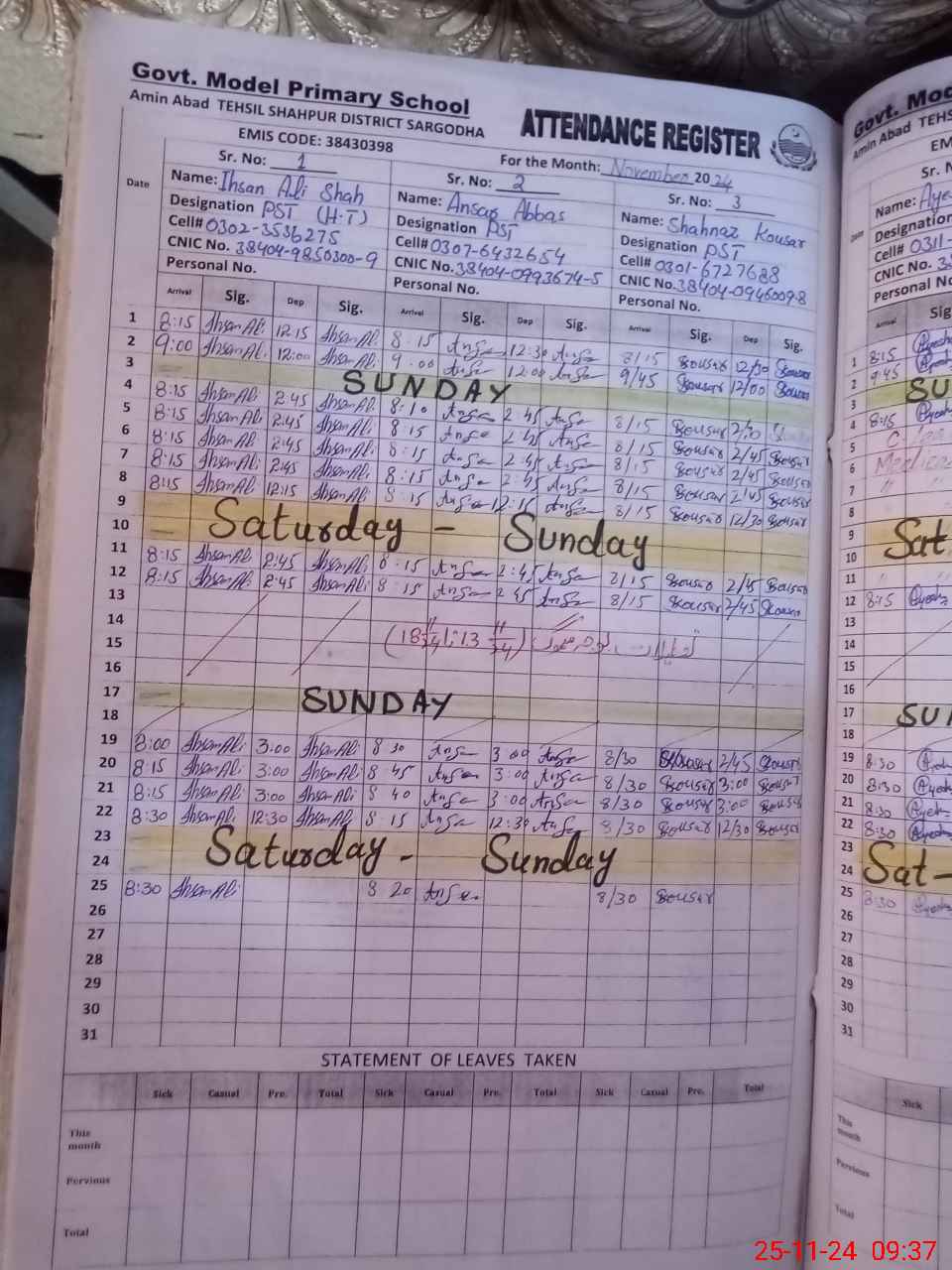 | CNIC | Full Name | Designation | R/C | Absence during last cal. month |