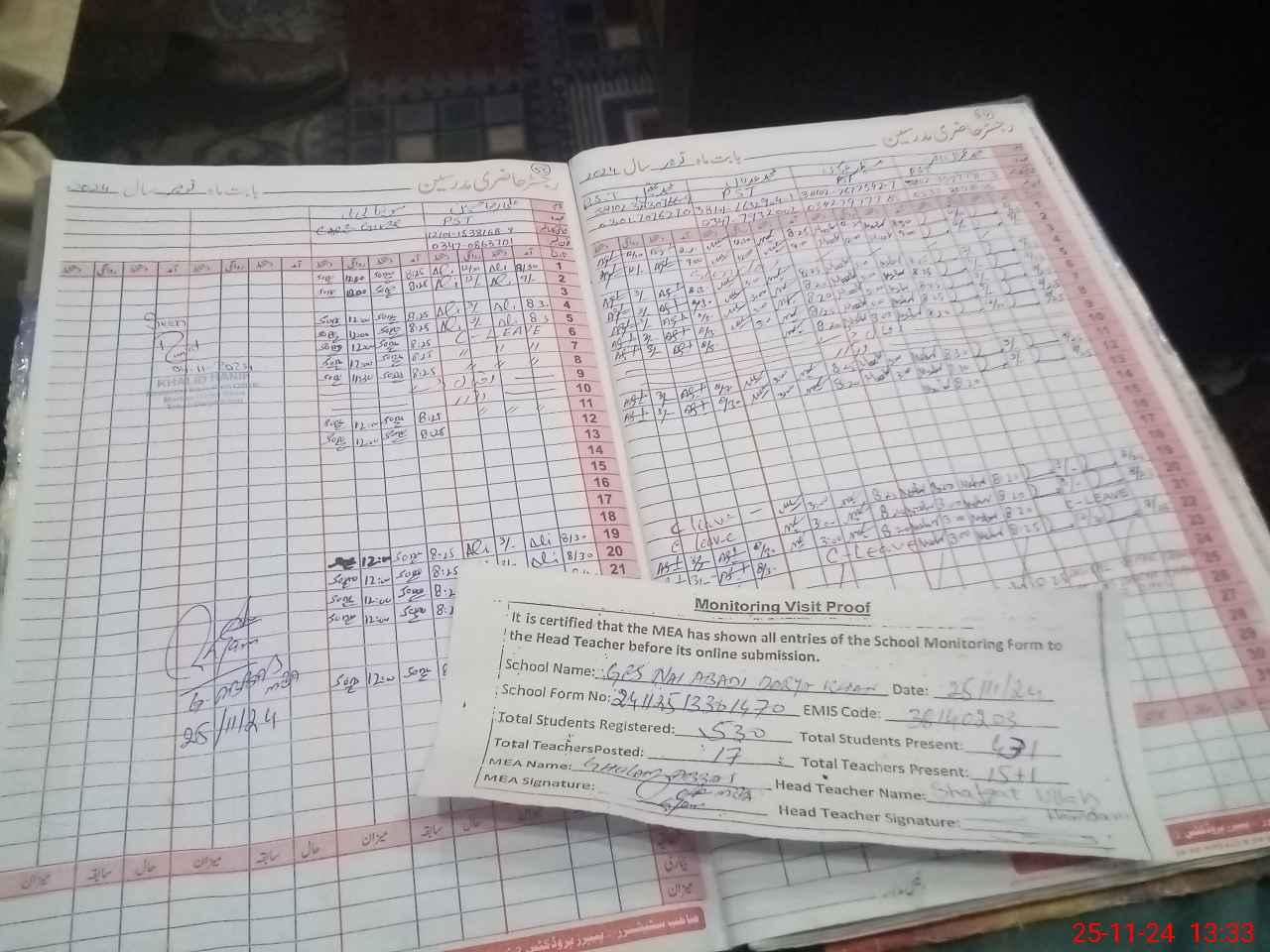| Attendance Register | Head Teacher | MEA with School | Visit Proof |