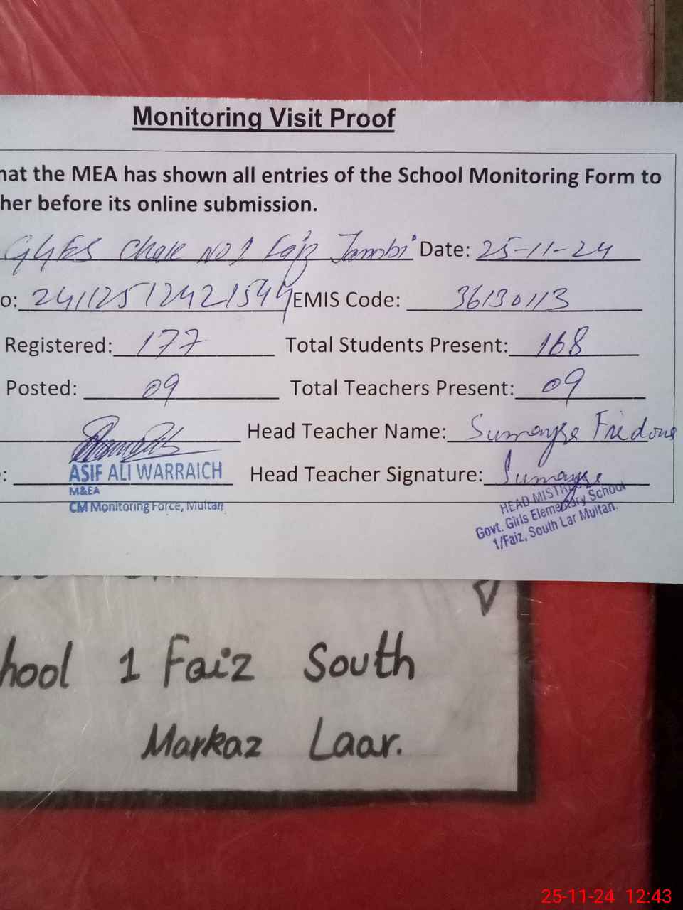 | Attendance Register | Head Teacher | MEA with School | Visit Proof |