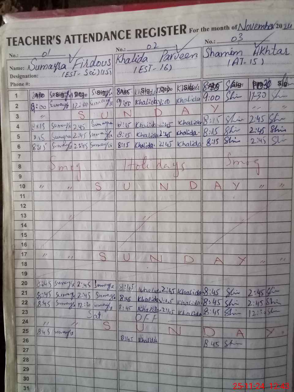 | CNIC | Full Name | Designation | R/C | Absence During Last Calender Month |