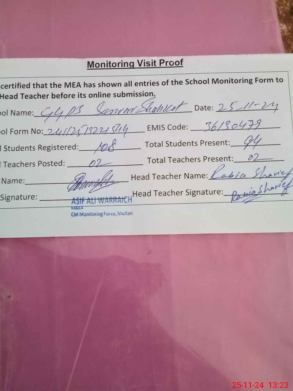 | Attendance Register | Head Teacher | MEA with School | Visit Proof |