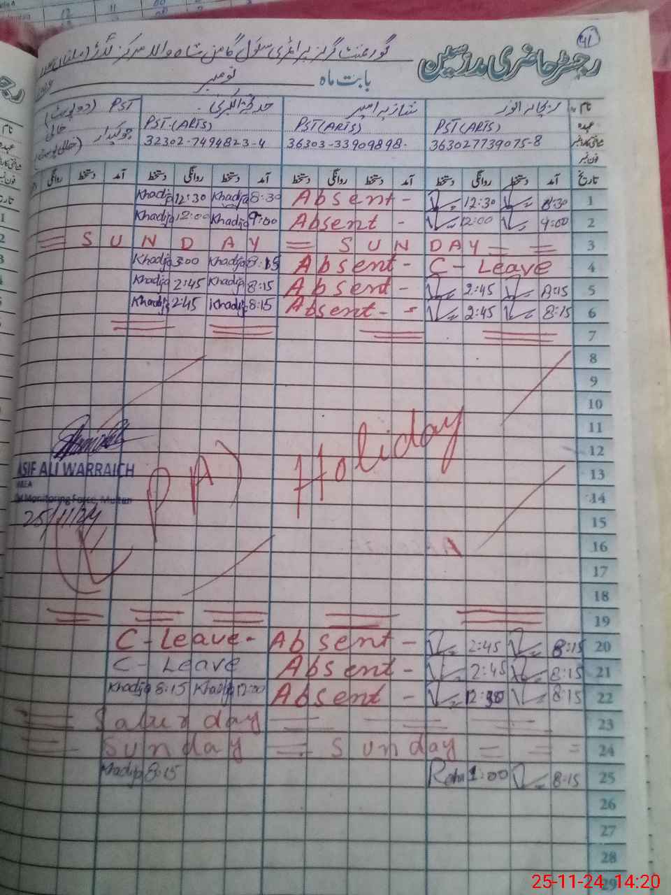 | CNIC | Full Name | Designation | R/C | Absence During Last Calender Month |