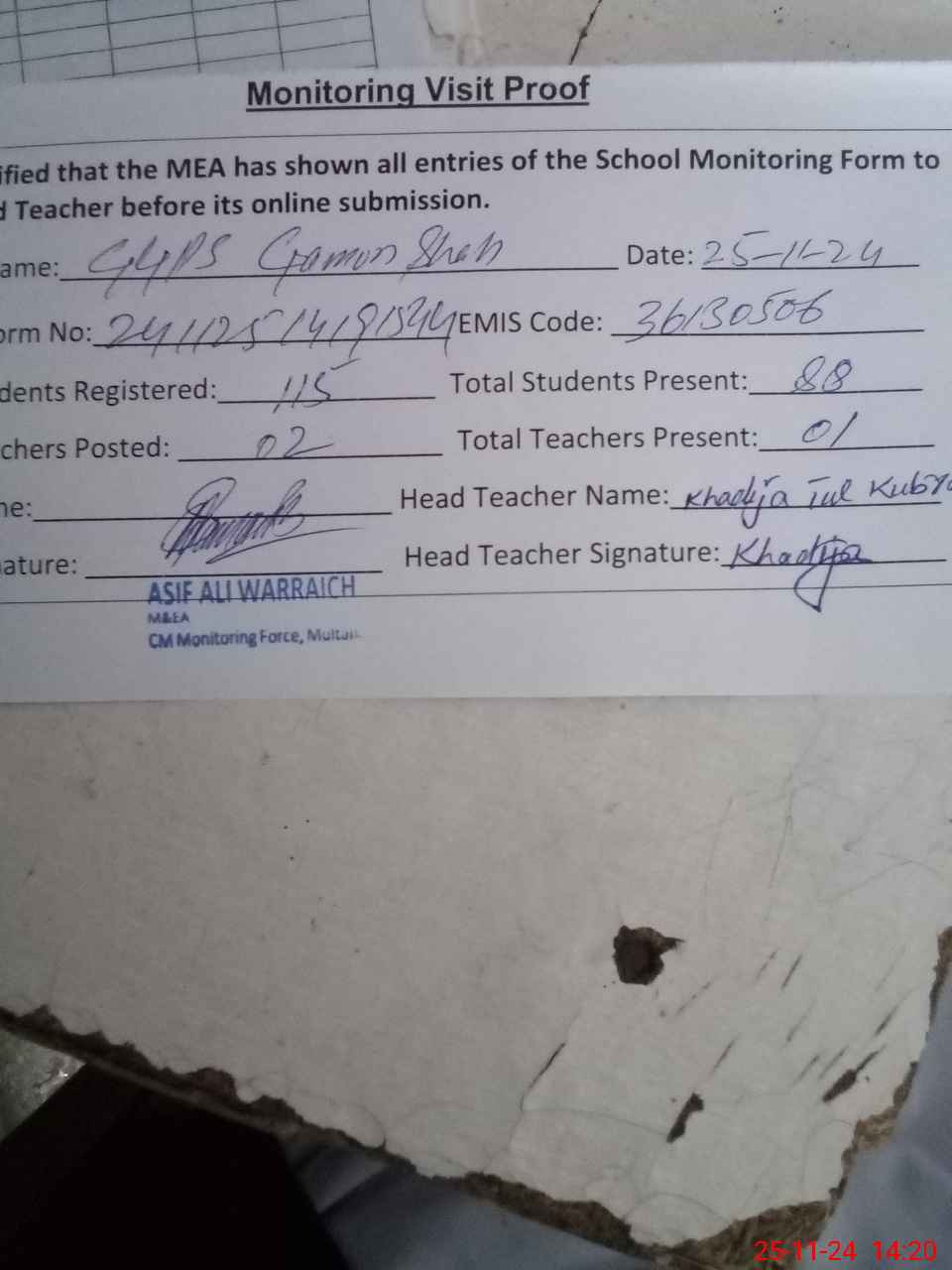 | Attendance Register | Head Teacher | MEA with School | Visit Proof |