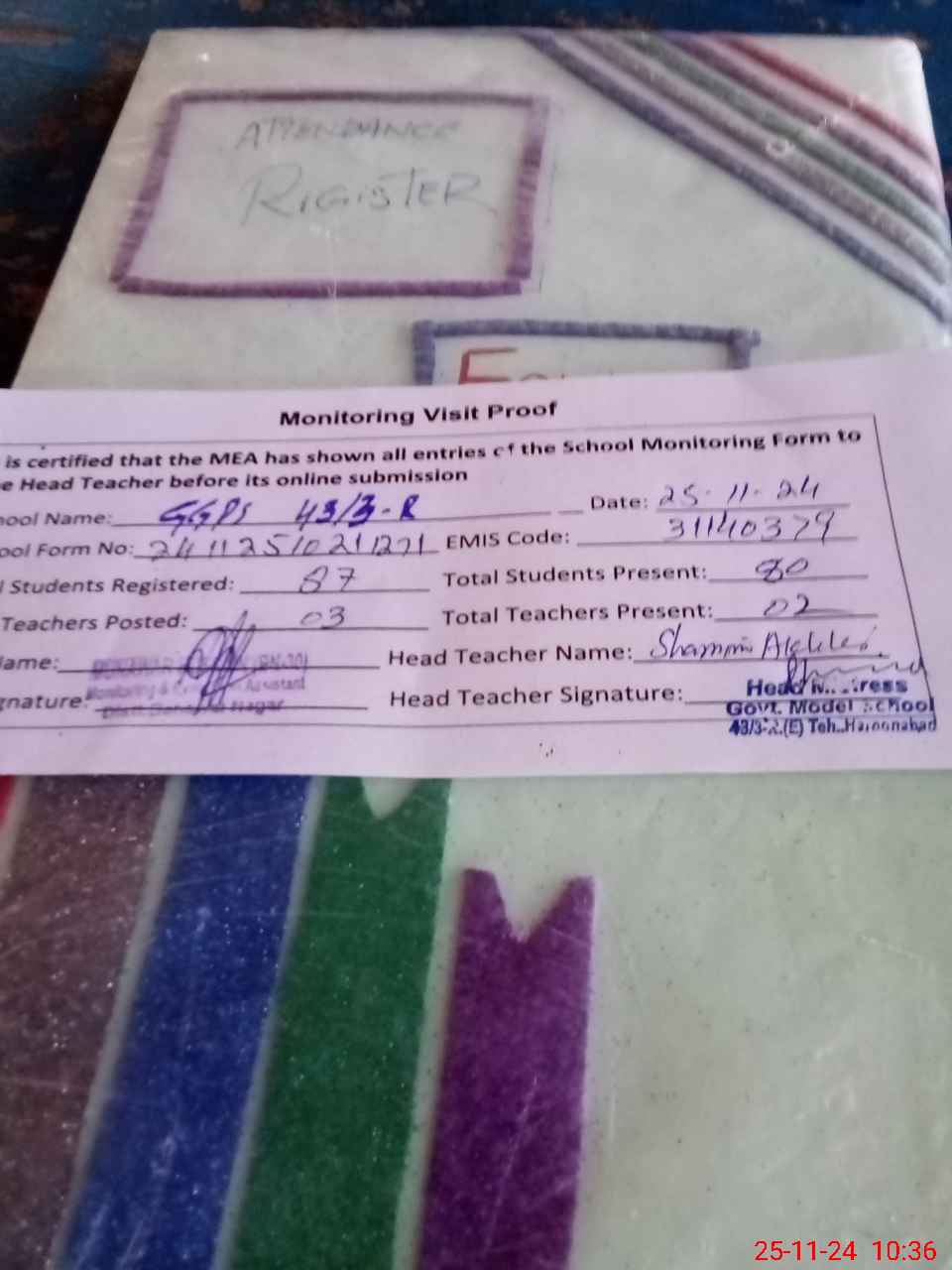 | Attendance Register | Head Teacher | MEA with School | Visit Proof |