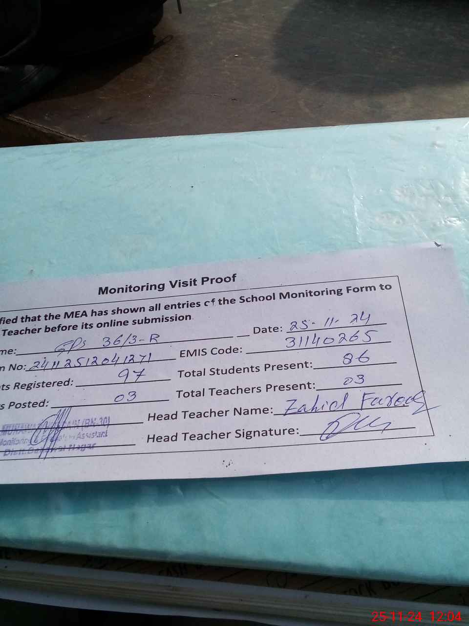 | Name: Za**** Fa**** Designation: (School Headmaster's/Headmistress's) PST Phone/Cell Number: 03**** |