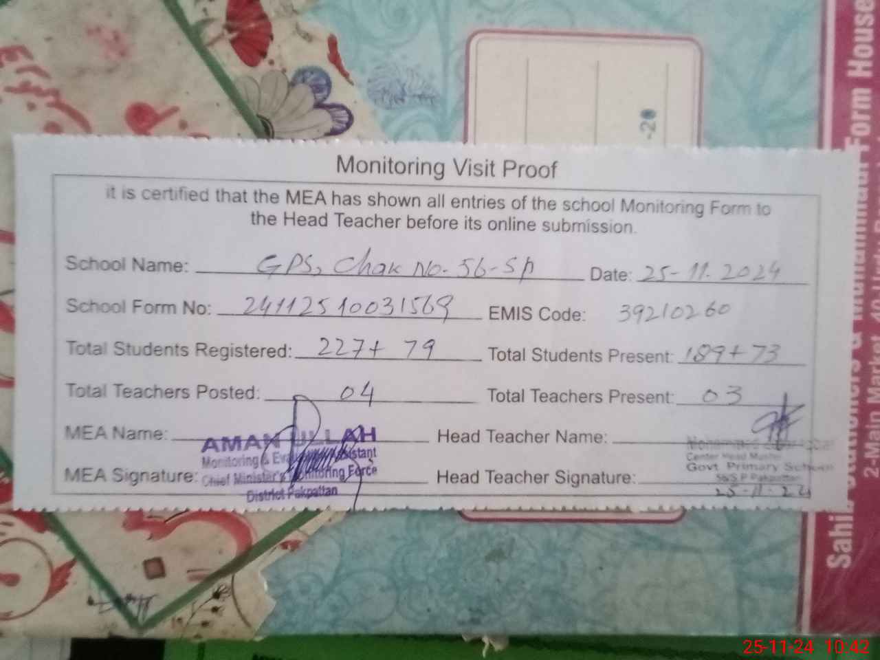 | EMIS Code: 39210260 | Name of School: GPS CHAK NO. 56 SP | |||