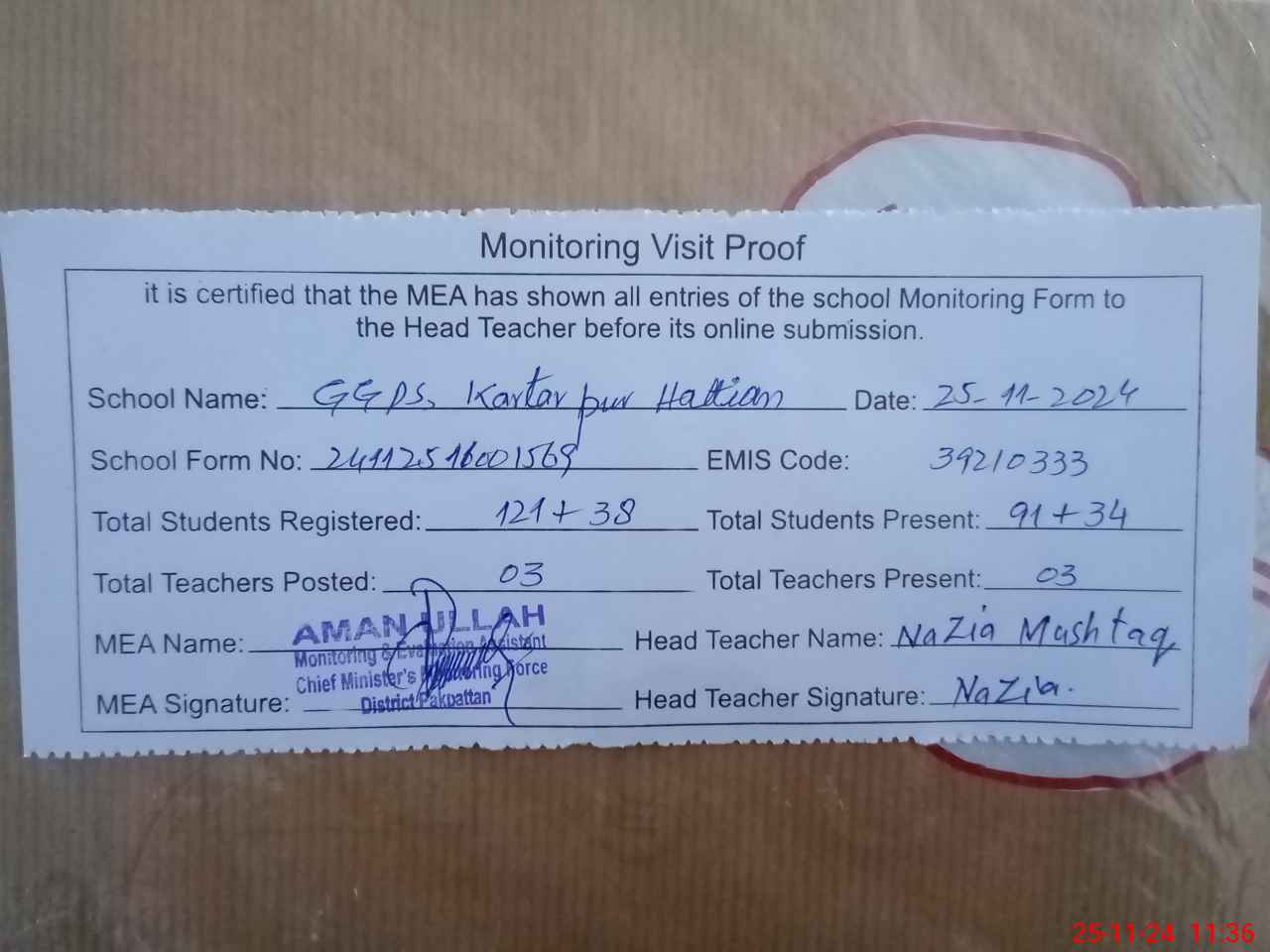 | Attendance Register | Head Teacher | MEA with School | Visit Proof |
