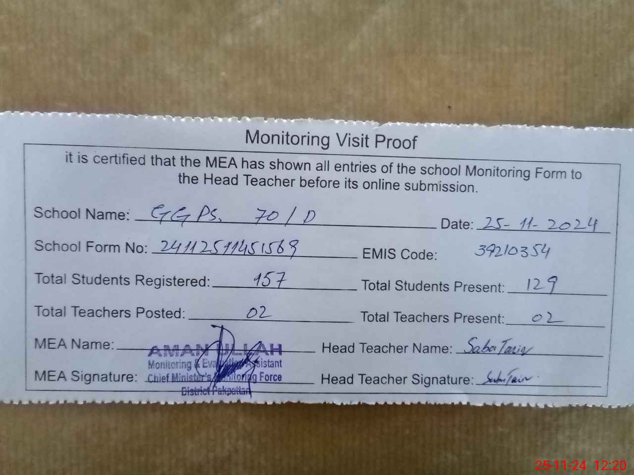 | Attendance Register | Head Teacher | MEA with School | Visit Proof |