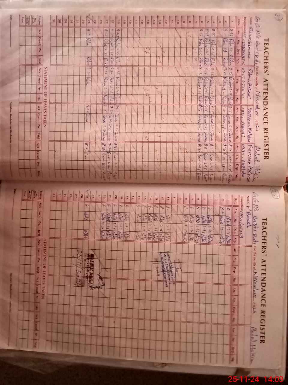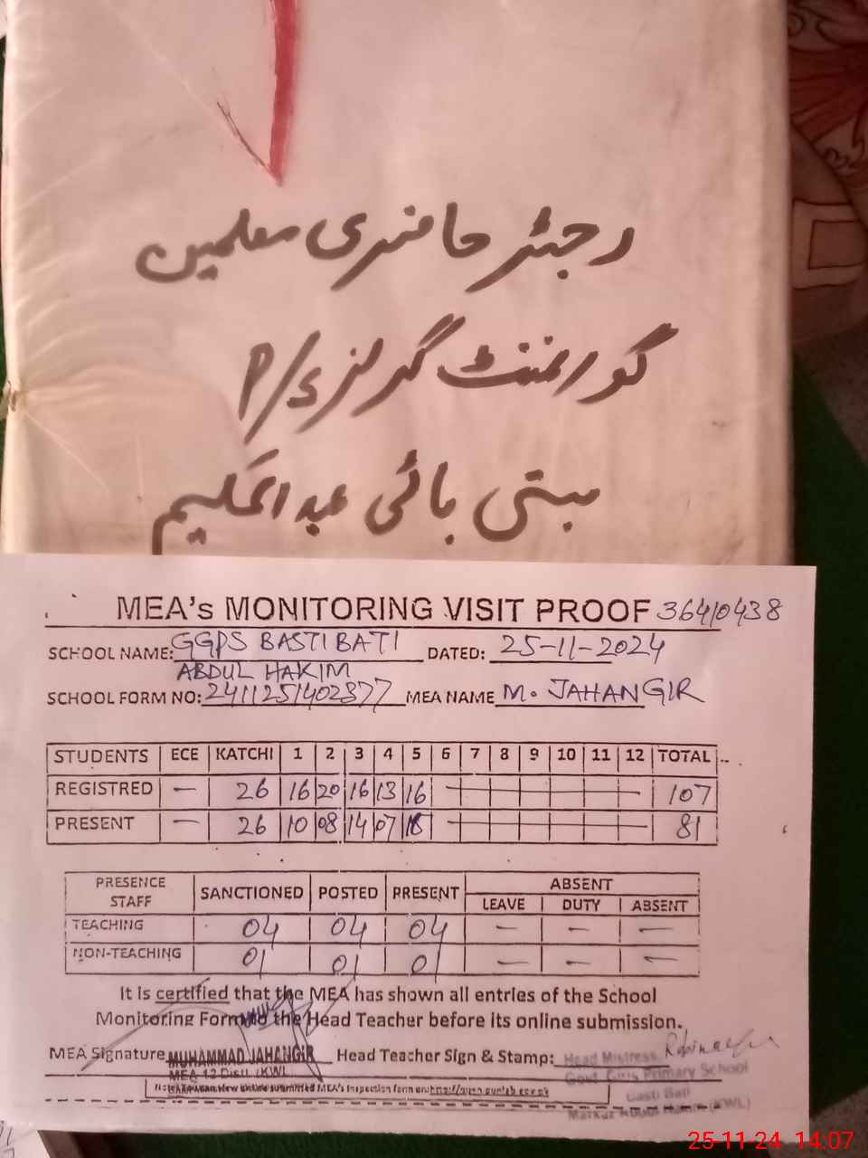 | Remarks (Use Separate Page if Required): NSB GRANTS RECORDS ARE NOT MAINTAINED BANK STATEMENTS UPTO 16 SEPTEMBER 2024 AVAILABLE ONE TOILET FOUND NON FUNCTIONAL DUE TO MOTOR PUMP IS FITTED IN THIS TOILET LESSON PLANS ARE NOT AVAILABLE WASH CLUB RECORDS UPTO 10 MAY 2024 IS WRITTEN RANDOM CLASS THREE IS NOW PASSED OUT FROM THIS SCHOOL | |||||
