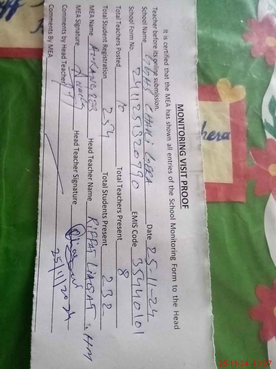 | Attendance Register | Head Teacher | MEA with School | Visit Proof |