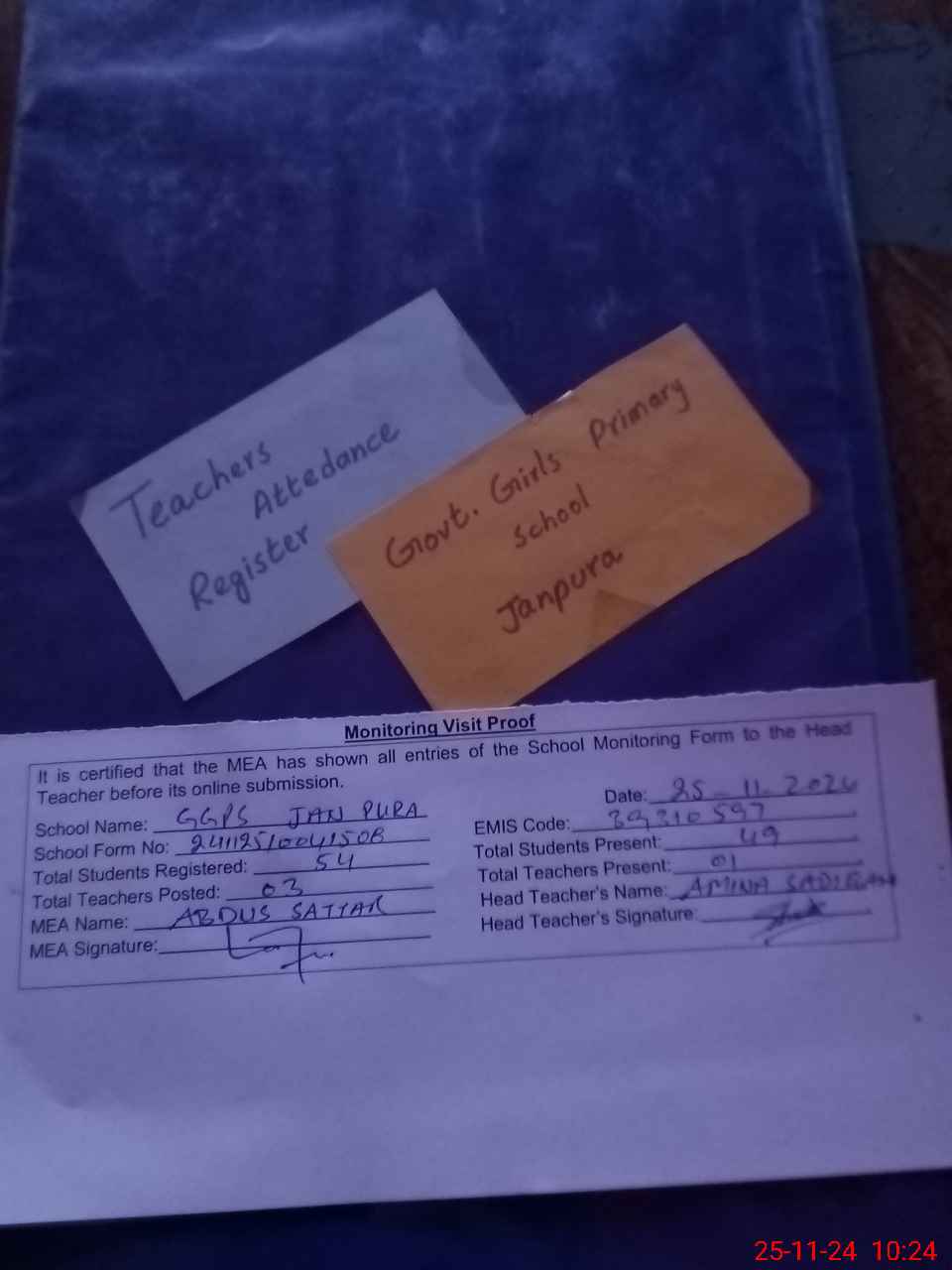 | Attendance Register | Head Teacher | MEA with School | Visit Proof |