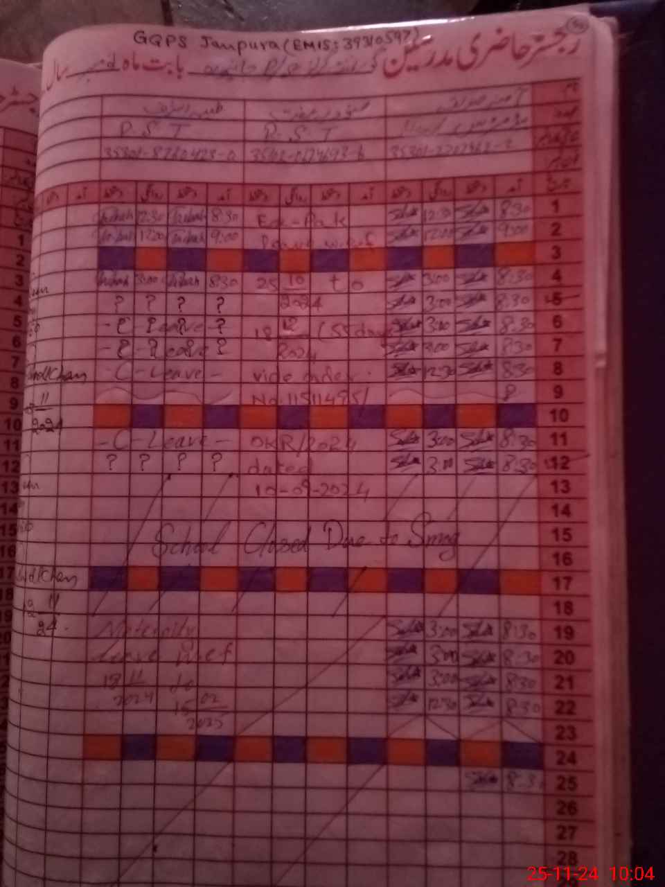| CNIC | Full Name | Designation | R/C | Absence During Last Calender Month |
