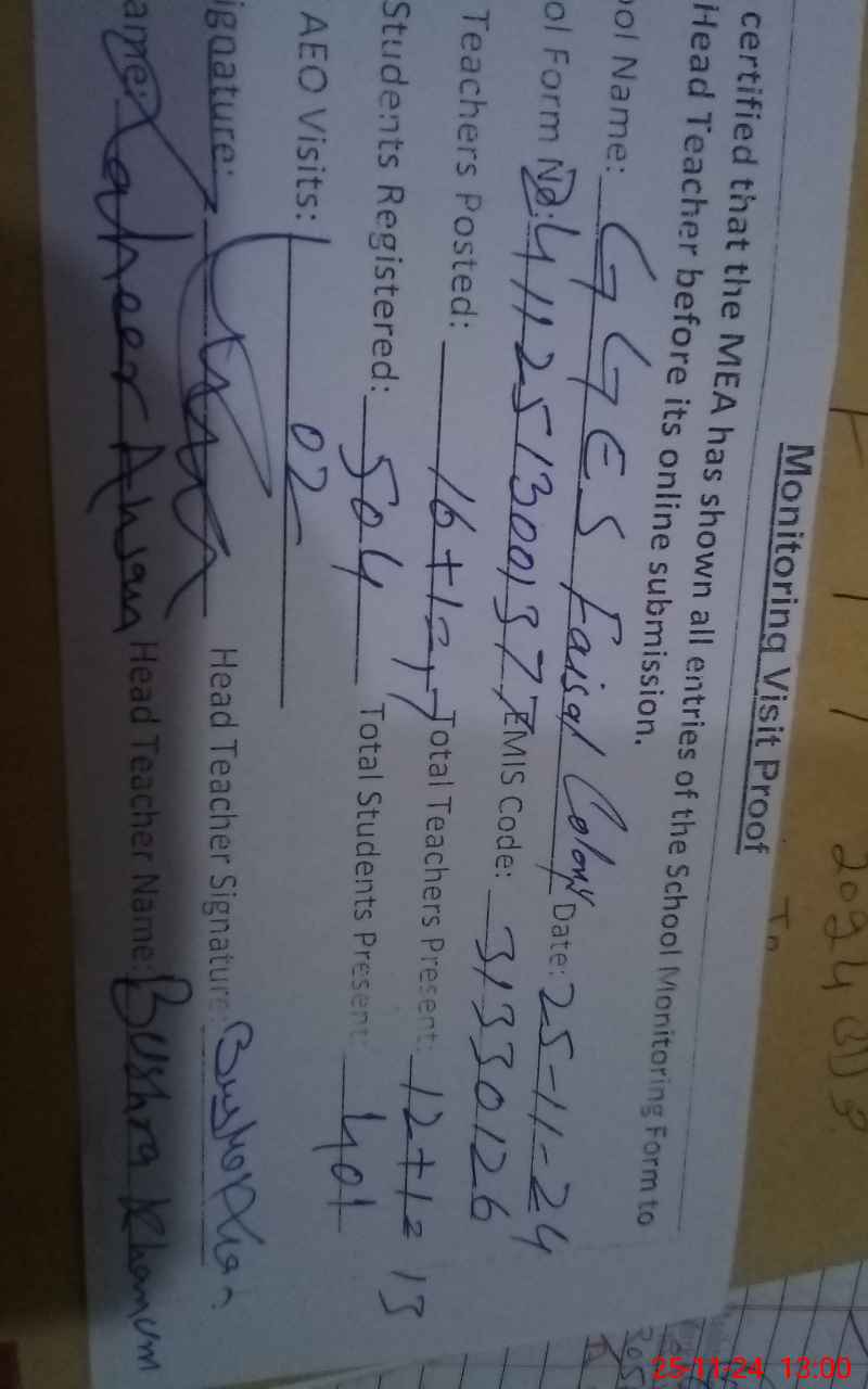 | EMIS Code: 31330126 | Name of School: GGES FAISAL COLONY | |||
