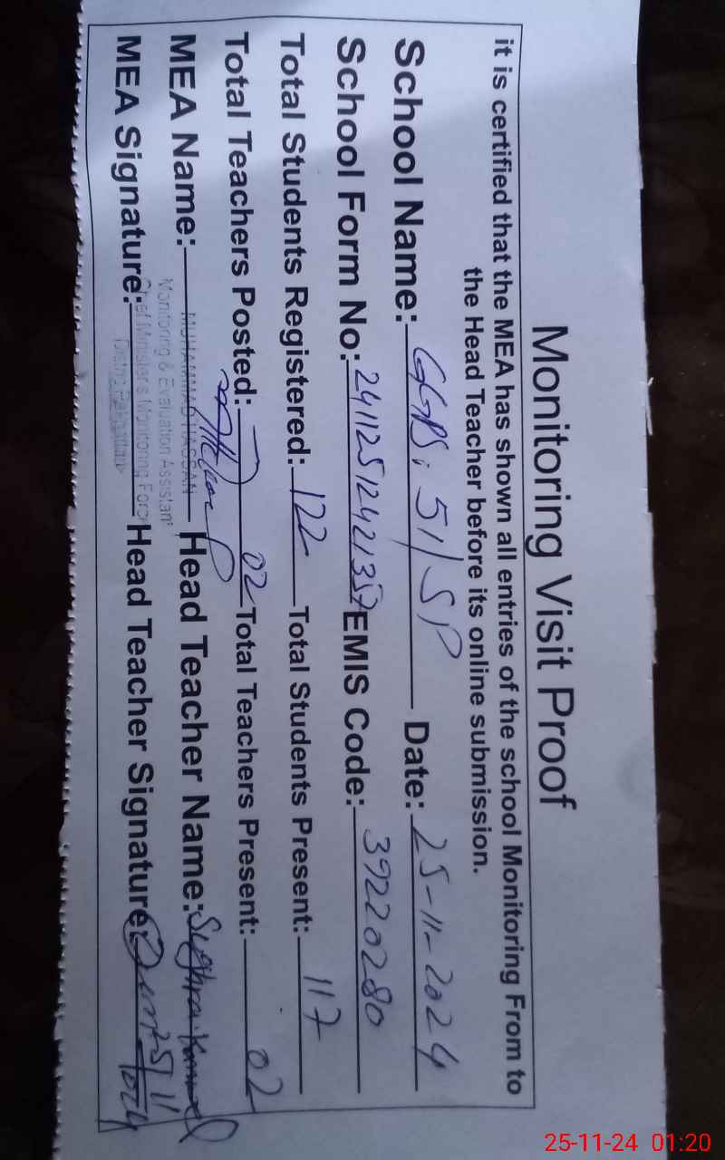 | EMIS Code: 39220280 | Name of School: GGPS 51 SP POST OFFICE JEVAN SHAH | |||