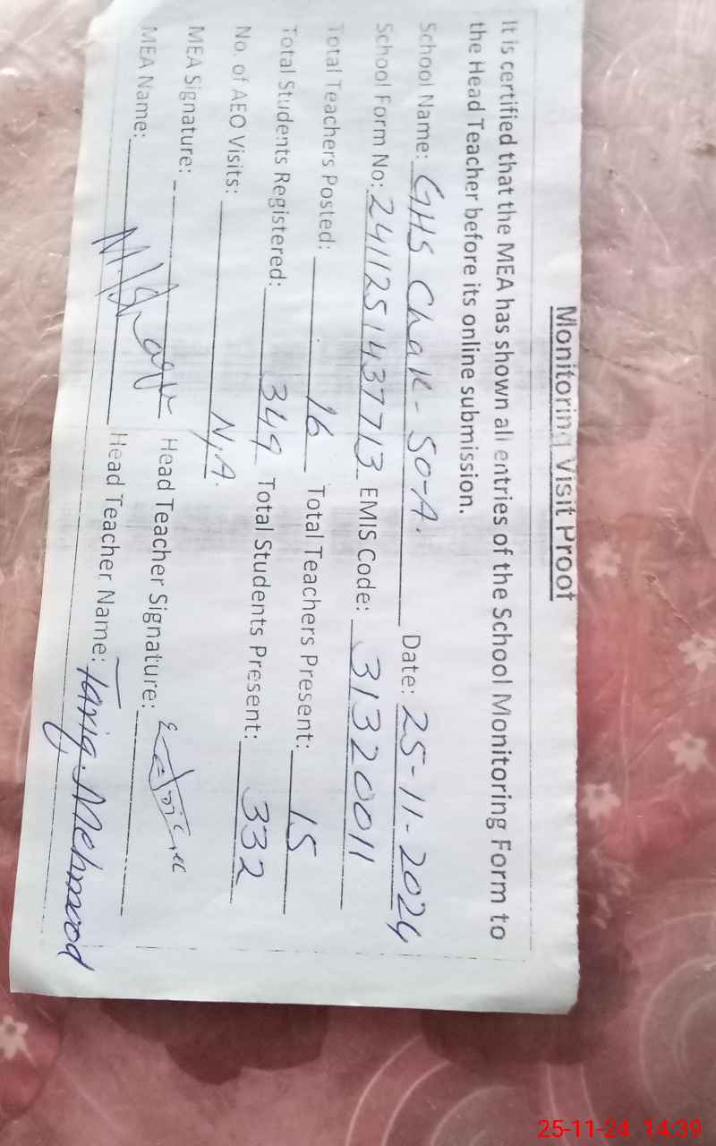 | EMIS Code: 31320011 | Name of School: GHS CHAK NO 50/A | |||