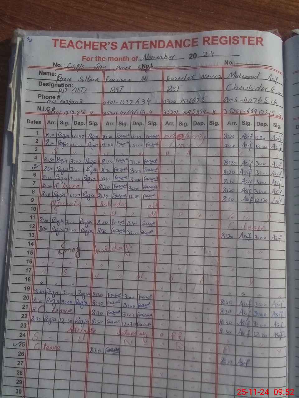 | CNIC | Full Name | Designation | R/C | Absence during last cal. month |
